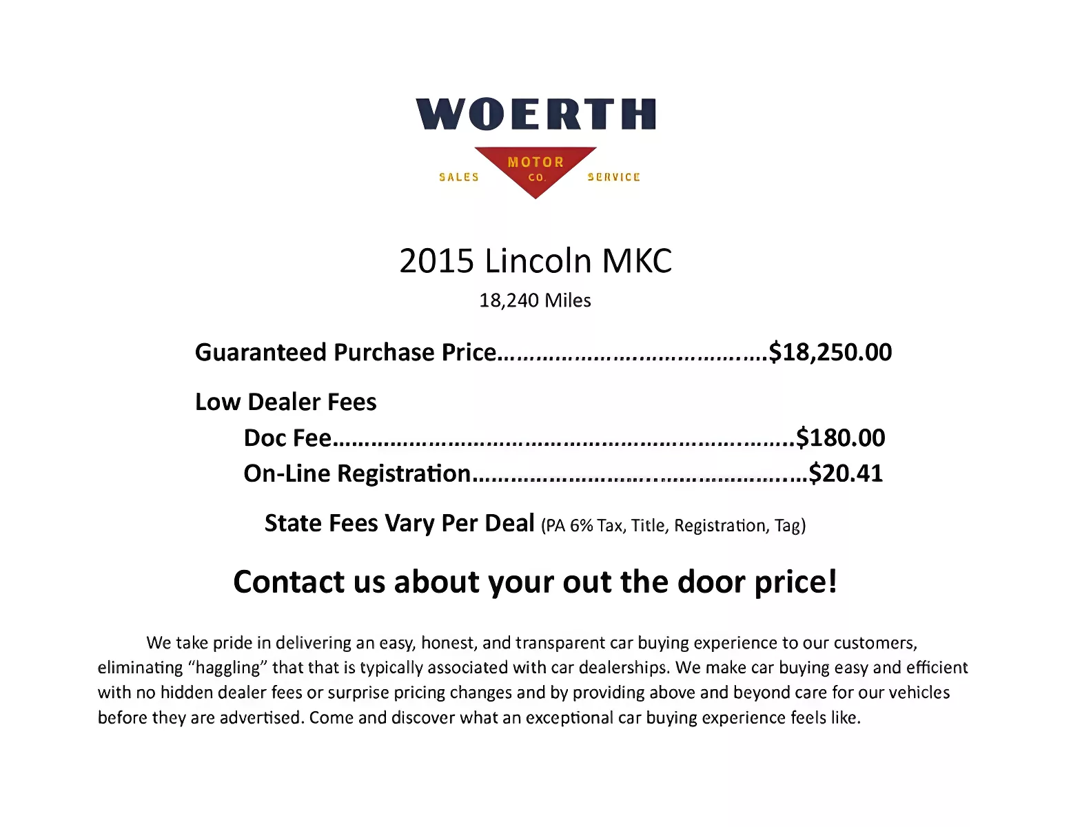 Experience luxury and performance with this 2015 Lincoln MKC, boasting only 18,240 miles. This Tuxedo Black Metallic beauty features a powerful EcoBoost engine delivering 285hp and an all-wheel-drive system for superior handling. Enjoy the premium feel of leather seats, complete with heating for added comfort. Stay connected effortlessly with Bluetooth technology and navigate confidently using the built-in navigation system. The backup camera ensures safe maneuvering while remote start adds convenience to your daily routine. With a clean CARFAX report showing just one owner and no accidents, this MKC is ready to elevate your driving experience with elegance and reliability. This Lincoln MKC comes with our Powertrain Warranty and there are also additional extended warranties available. All our vehicles are serviced, state inspected and ready to go! We have financing options available. Feel free to Call or Text us at 717-789-7735 if you have any questions!