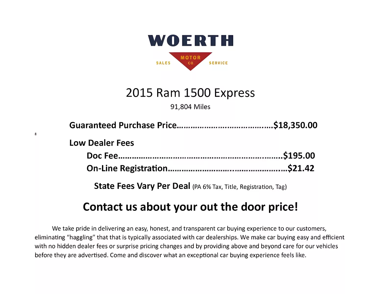 Unleash the power of the 2015 Ram 1500 Express, a robust pickup that combines performance and style. Dressed in striking Flame Red Clearcoat, this truck is driven by a formidable HEMI 5.7L V8 engine delivering an impressive 395 horsepower and 410 lb-ft of torque. With its smooth TorqueFlite 8-speed automatic transmission and reliable 4WD system, it’s ready for any adventure. Enjoy modern conveniences like Bluetooth connectivity and a backup camera for added safety. Boasting a clean CARFAX report with no accidents and just over 91k miles, this Ram offers reliability you can trust on every journey. This Ram 1500 Express comes with our Powertrain Warranty and there are also additional extended warranties available. All our vehicles are serviced, state inspected and ready to go! We have financing options available. Feel free to Call or Text us at 717-789-7735 if you have any questions!